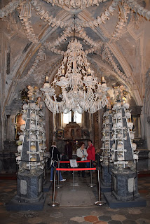 A kb. 75 kilométeres utazás nem tartott sokáig, pontban kilenc órakor a város egyik nevezetessége ,az osszárium vagy más néven csontkápolna előtt álltunk. 1278-ban a helyi apátot II.Ottokár király a Szentföldre küldte, s amikor az apát hazaérkezett, hozott magával némi földet a Golgotáról, s ezt széthintette az apátság kertjében. Eme nemes cselekedet híre hamar elterjedt, s ennek hatására igen vágyott temetkezési hely lett, és a temető területe hatalmasra duzzadt. 1400 körül épült a gótikus kápolna és itt helyezték el a korábban eltemetettek csontjait is. A Schwarzenberg család 1870-ben megbízta Frantisek Rin fafaragót, hogy rendezze a kápolnában található csontokat, mivel több területet nem tudnak biztosítani. A jóember hátborzongató munkát végzett, az egyszer biztos... A kápolna ajtaján belépve az edzett horror fogyasztók is ledöbbennek : egy, az emberi test valamennyi csontját felhasználva készült csillár az amit először megpillant a gyanútlan látogató, és ha nem figyel, a terembe vezető lépcsőt rögtön gurulva teszi meg. A terem közepén négy kőalapzaton egy -egy csontokból készült oszlop látható, és a terem valamennyi oszlopát csontok díszítik. A teremben négy , harang alakú csonthalom látható az egyik előtt emberi csontokból van kirakva a Schwarzenberg család címere is....